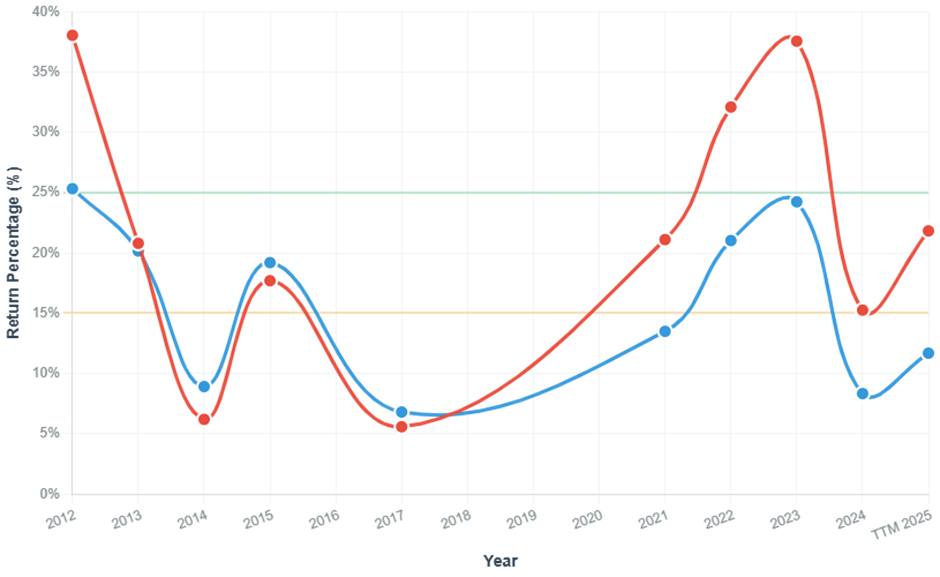 - ROE between 20–38%, recent years also above 30% (top in industry)