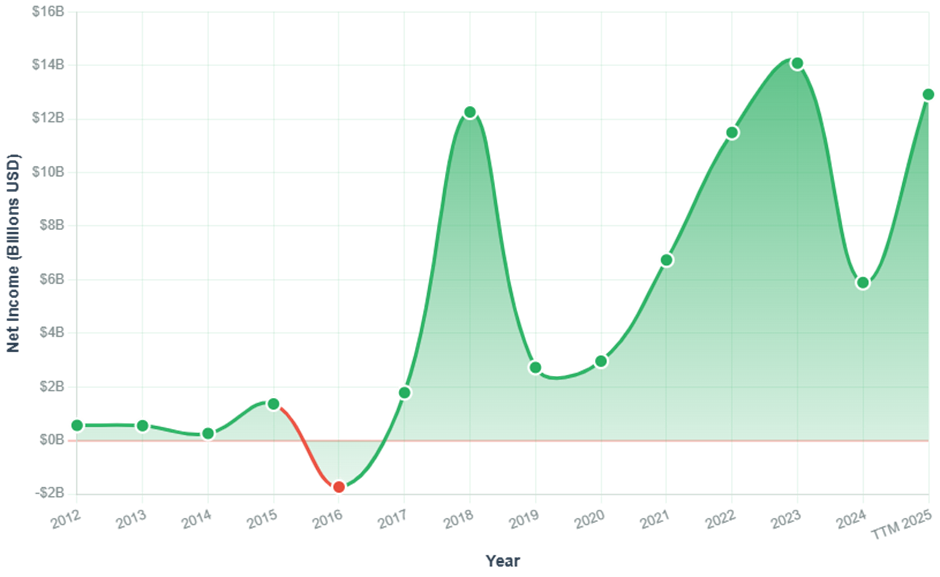 - Growing from $563M (2012) to nearly $13B (TTM). Negative result only in 2016 due to exceptional items (likely acquisition)