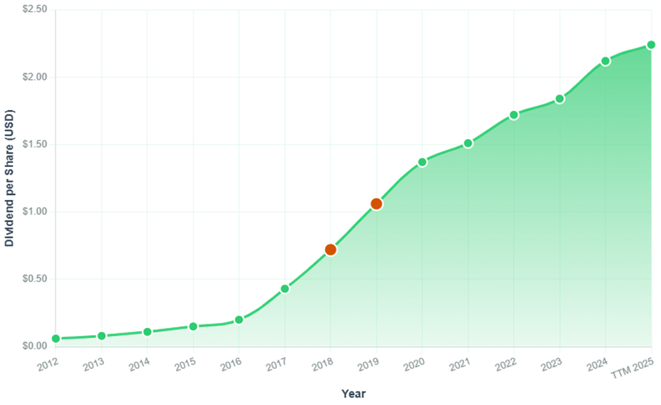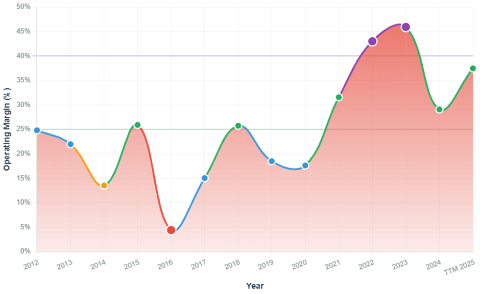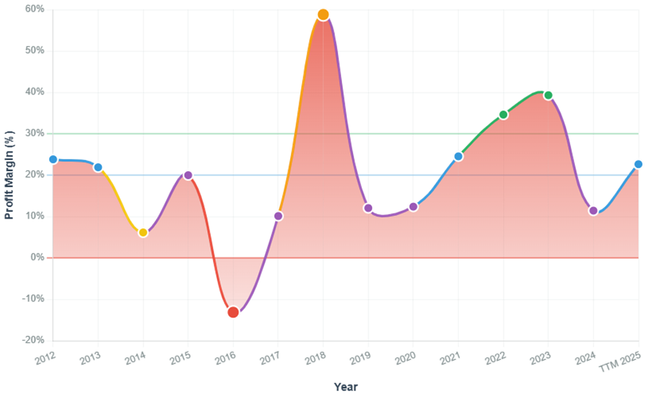 - From 23% (2012), to over 30–40% (2022–2024), TTM 22.6%